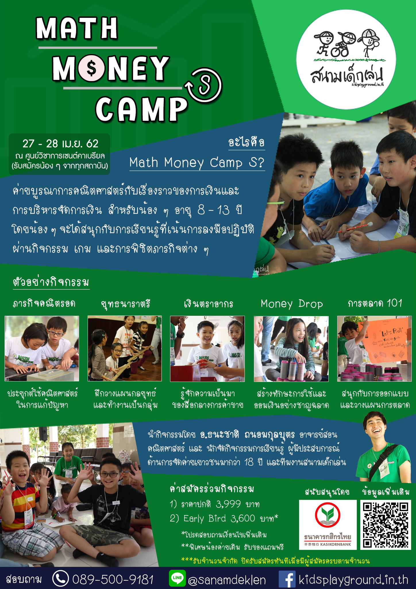 กลับมาอีกครั้งกับค่ายคณิตศาสตร์แบบบูรณาการแสนสนุกจากสนามเด็กเล่น ที่เน้นให้น้อง ๆ อายุ 8 – 13 ปี ได้สนุกกับการการผจญภัยอุดมความรู้ผ่านกิจกรรม เกม และภารกิจมากมาย โดยในปีนี้มาใน Theme การเงินกับค่าย “Math Money Camp” ที่จะพาน้อง ๆ ไปสนุกกับการผจญภัยอุดมความรู้ในโลกของการเงินแบบต่อเนื่อง 2 วัน 1 คืน ในวันที่ 27 – 28 เมษายน 2562 นี้ที่ ศูนย์วิชาการและนันทนาการเซนต์คาเบรียล 2000 (รับสมัครน้อง ๆ จากทุกสถาบัน)